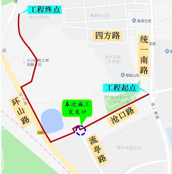 三、通行方案:施工期間,流亭路與滄口路交叉口南側(cè)道路封閉,在原有道路南側(cè)修筑便道,滿足車輛雙向兩車道通行。施工期間便道兩側(cè)禁止停車。