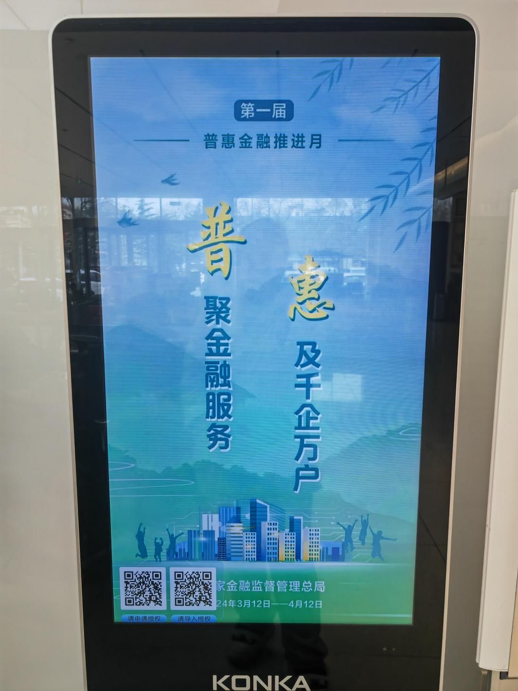 圍繞“普聚金融服務,惠及千企萬戶”活動主題,在轄內(nèi)多個網(wǎng)點電子屏統(tǒng)一布放國家金融監(jiān)管總局下發(fā)的宣傳海報,LED屏滾動播放“普惠金融推進月”、“普聚金融服務,惠及千企萬戶”等宣傳信息,通過多種形式的宣傳活動,積極對接市場主體和人民群眾金融需求,宣傳介紹普惠金融政策和產(chǎn)品,以高質(zhì)量的金融服務,為服務實體經(jīng)濟發(fā)展貢獻招行力量!