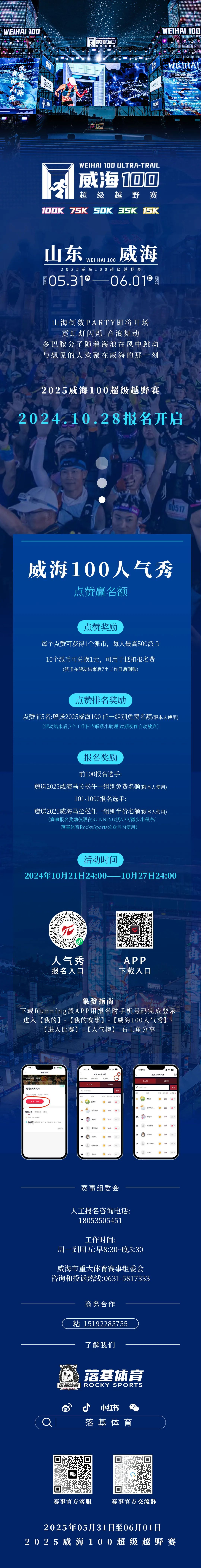 2025威海100超級越野賽由威海市重大體育賽事組委會主辦,威海市體育局、威海市體育總會承辦,煙臺落基體育有限公司具體負(fù)責(zé)賽事運(yùn)營。賽事設(shè)100KM、75KM、50KM、30KM、15KM共5個(gè)競賽距離,將接受不超過3000人報(bào)名參賽。